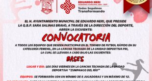 El Gobierno Municipal de Eduardo Neri, que preside la Q.B.P. Sara Salinas Bravo, a través de la Dirección del Deporte, abren las Siguientes Convocatorias: Torneo Fútbol Rápido Categoría Femenil Torneo Fútbol Rápido Categoría Sub-12 Torneo Fútbol Rápido Categoría Sub-10 Torneo Fútbol Rápido Categoría Sub-8 Información en cada convocatoria Junta Previa: …