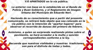 En vísperas de la celebración de nuestra fiesta grande, la Feria de la Candelaria en honor al Señor de las Misericordias, edición 179, exhortamos a la población de Zumpango del Río a EVITAR COLOCAR PINTAS Y/O APARTADOS en la vía pública. Lo anterior con base en lo establecido en el …