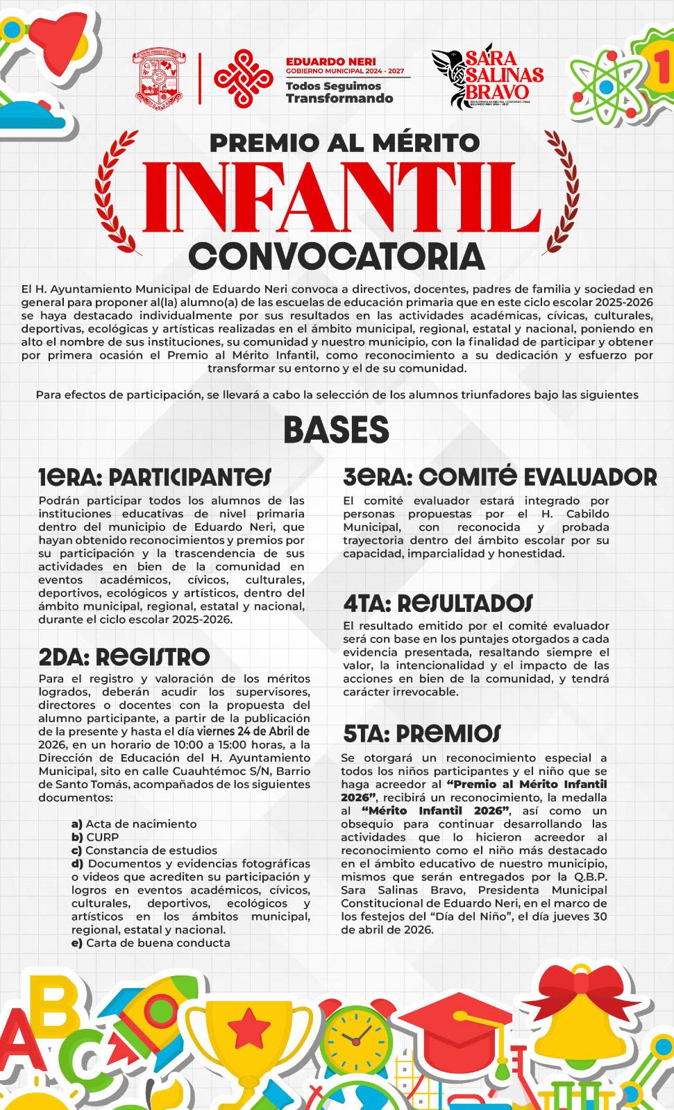 El H. Ayuntamiento Municipal de Eduardo Neri, que preside la Q.B.P. Sara Salinas Bravo, convoca a directivos, docentes, padres de familia y sociedad en general para proponer al alumno(a) de las escuelas de educación primaria, al