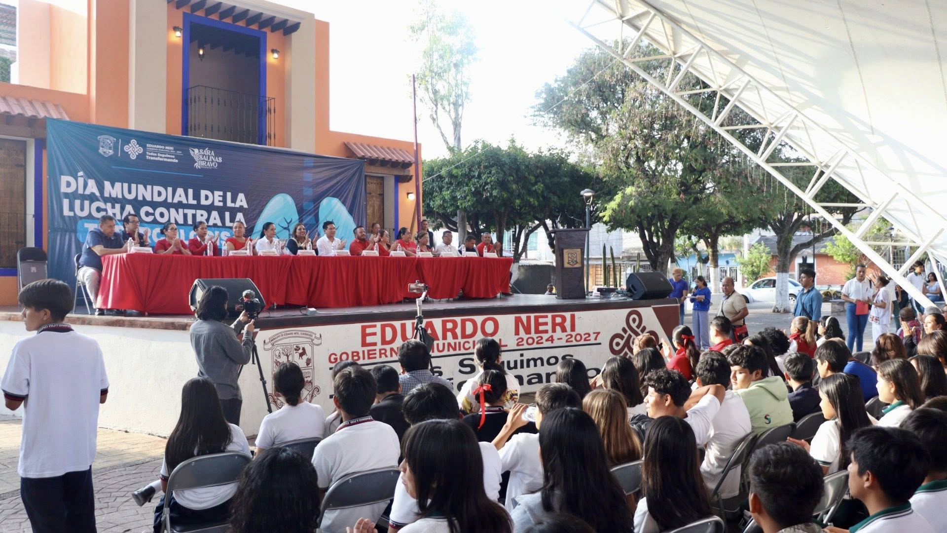 Acto realizado en la alameda central “Cnel. José María Bernal”, que contó con la presencia de la Dra. Alva Patricia Batani Giles, titular de la Jurisdicción Sanitaria 03 Centro, la Dra. Diana Deysi Avelino Guzmán, Coordinadora Municipal de Salud, Q.B.P. Serafín Goytia Vázquez, director de Salud en Eduardo Neri, integrantes del cabildo y el gabinete municipal, así como alumnado y representantes del sector educativo.