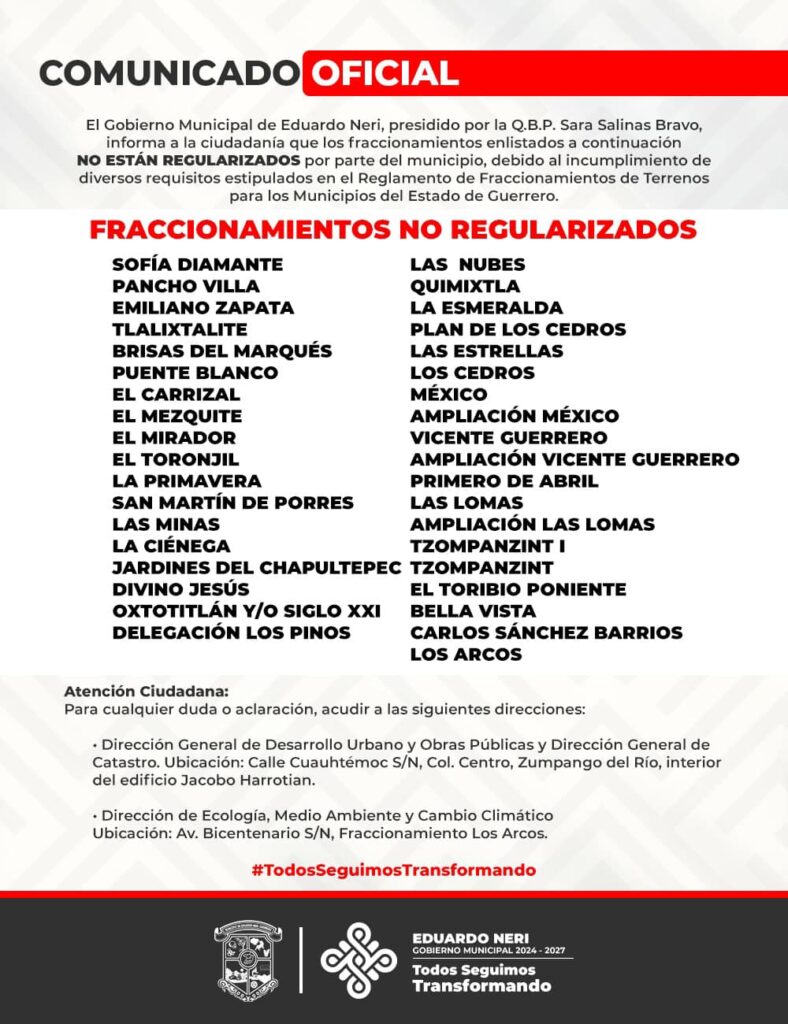 El Gobierno Municipal informa la relación de Fraccionamientos NO REGULARIZADOS en el municipio.