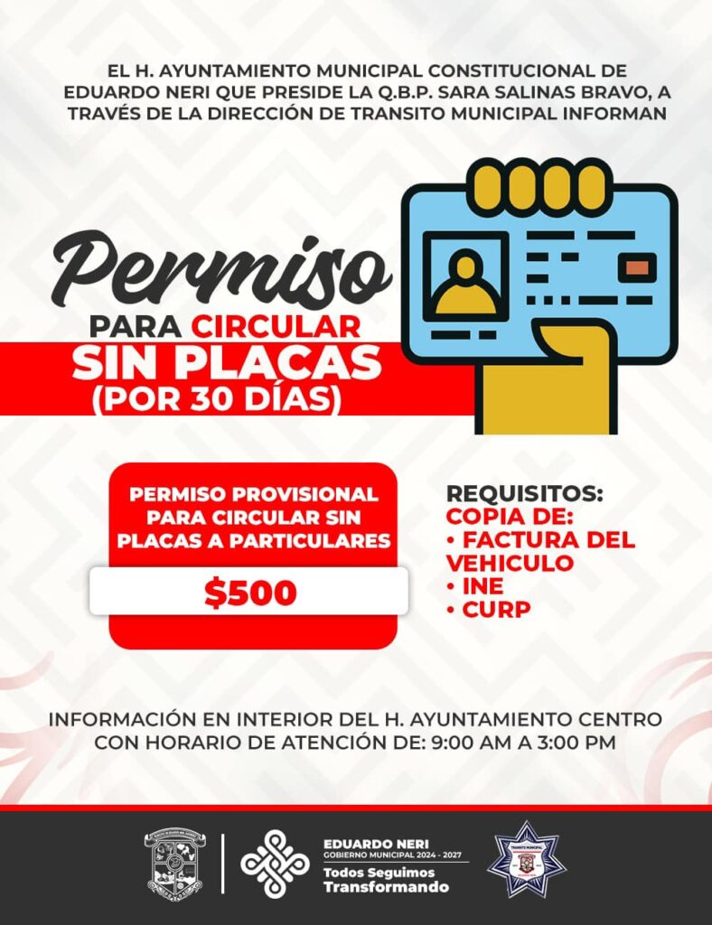 El Gobierno Municipal de Eduardo Neri, que preside la Q.B.P. Sara Salinas Bravo, a través de la Dirección de Tránsito Municipal, Informa: