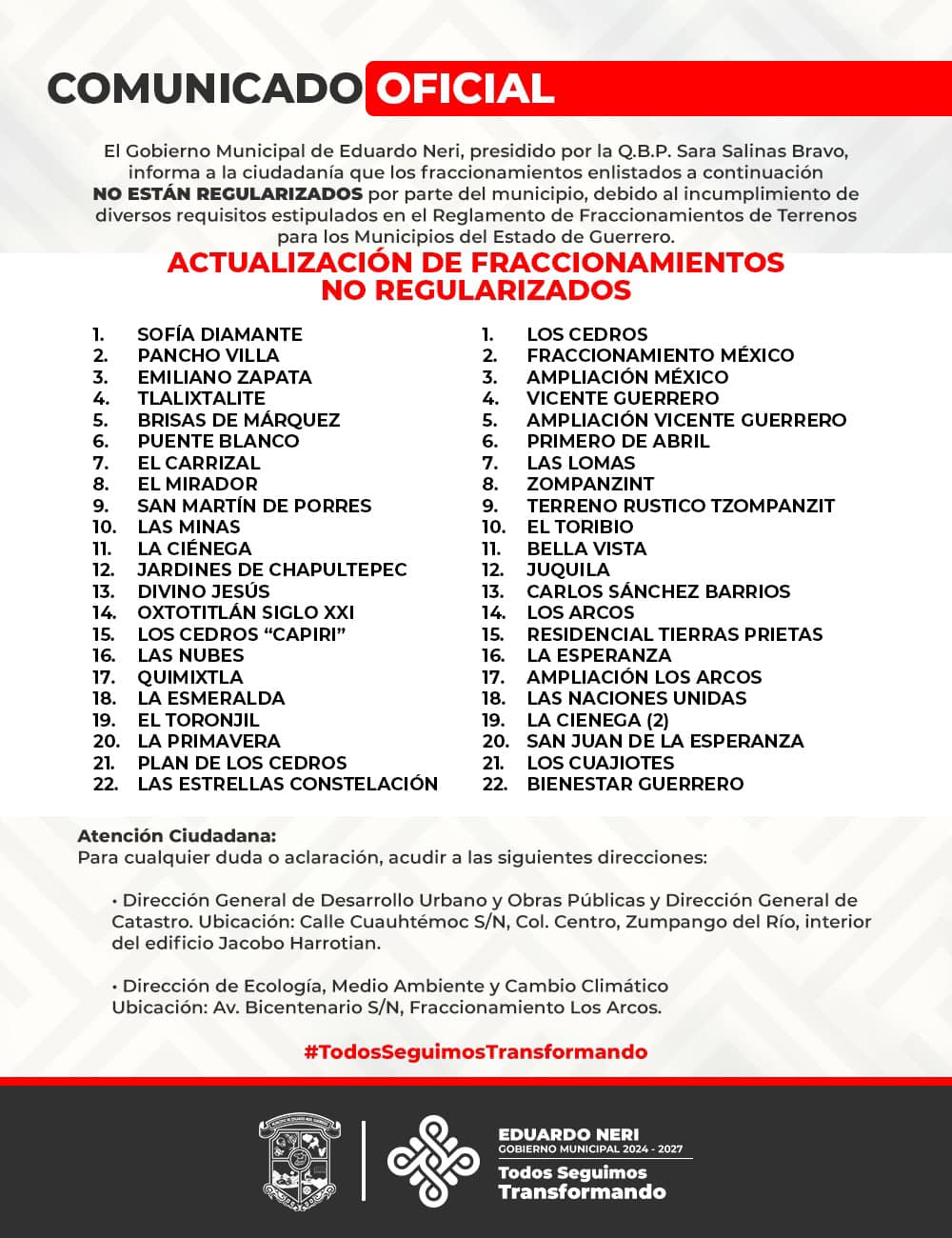 Para cualquier duda o aclaración, acudir a las siguientes Direcciones: -Dirección General de Desarrollo Urbano y Obras Públicas -Dirección General de Catastro Ubicadas en Calle Leer Nota.
