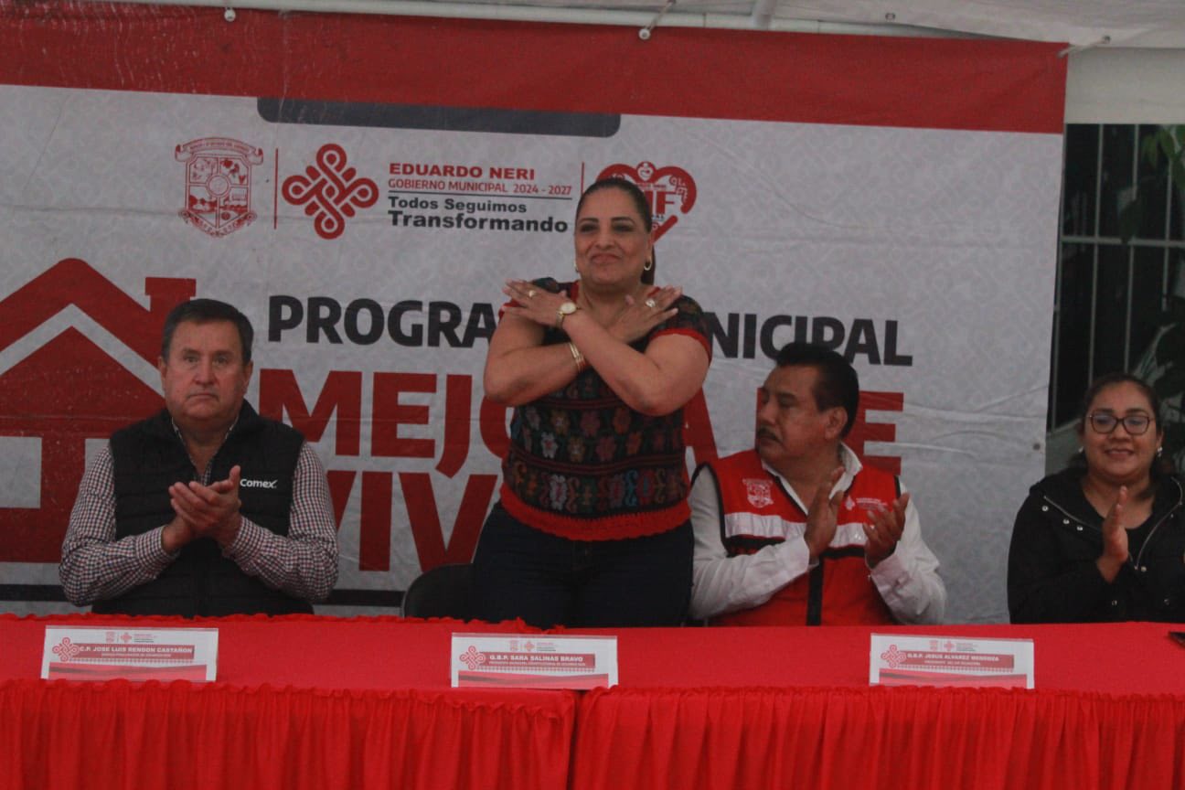La presidenta municipal, Q.B.P. Sara Salinas Bravo, encabezó la tarde de ayer la entrega de láminas a 30 familias de la colonia Santa María, Santo Tomás y el Barrio de San Antonio, que resultaron afectadas por el fenómeno natural que tuvo lugar en Zumpango de Río.