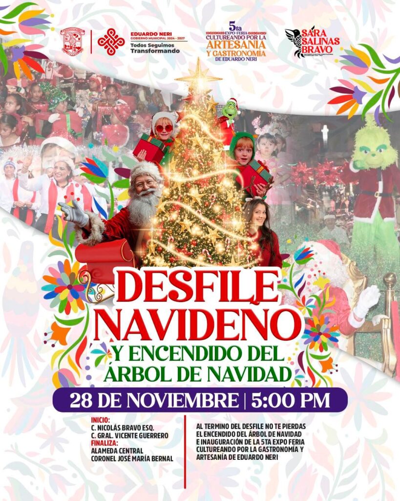 Desfile que iniciará en punto de las 5 de la tarde en la calle Nicolás Bravo esquina con calle Vicente Guerrero, Barrio de Santo Tomás, hasta llegar a la alameda central «Cnel. José María Bernal», donde al finalizar, llevaremos a cabo el tradicional encendido del Árbol Navideño.