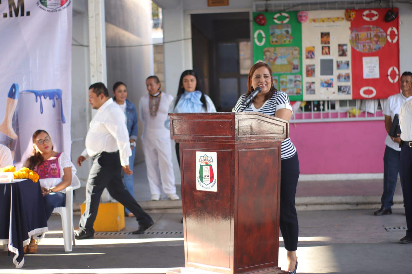 La presidenta, mencionó que la entrega de este material es un compromiso más que cumple su gobierno y con el que reitera su interés en la educación, la cual es un pilar fundamental para tener una mejor calidad de vida y una mejor sociedad, en cuya labor reconoció los esfuerzos de los padres de familia, y en especial de las y los docentes de esta institución, de la cual dijo ser una orgullosa egresada.