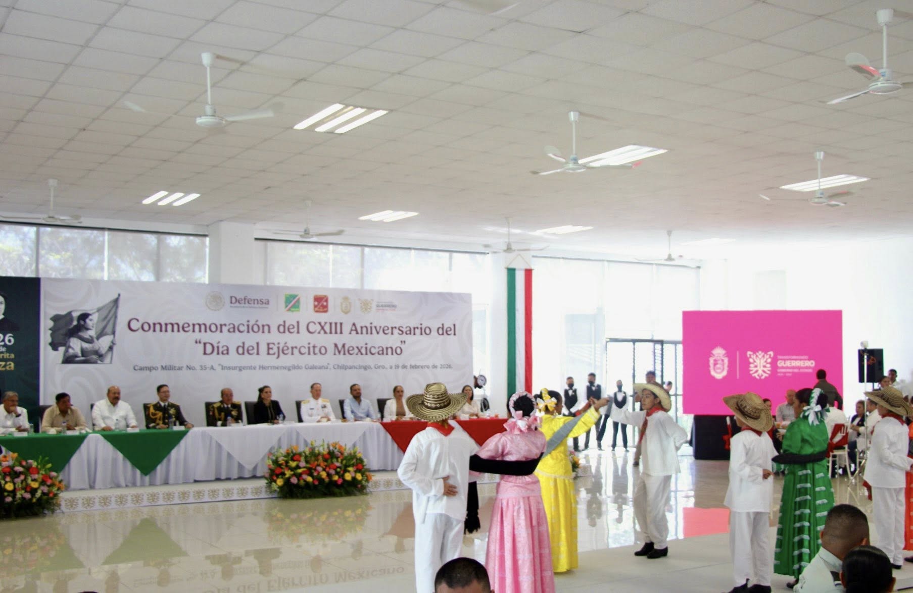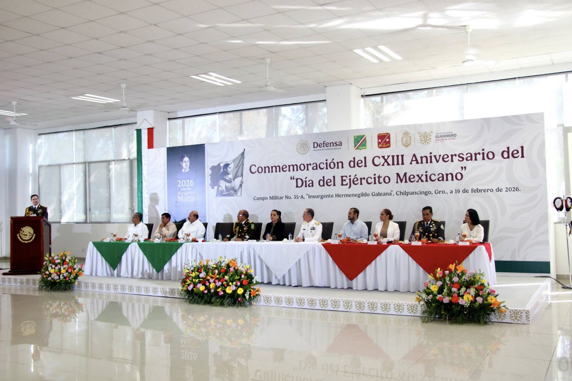 Chilpancingo de los Bravo, Gro; 19 de febrero de 2026. La Presidenta Municipal de Eduardo Neri, Q.B.P. Sara Salinas Bravo, asistió a la ceremonia conmemorativa del CXIII Aniversario del «Día del Ejército Mexicano», que presidió la gobernadora del estado, Mtra. Evelyn Salgado Pineda, y el General de División del Estado Mayor, José Roberto Flores Montes de Oca, Comandante de la Novena Región Militar, en el Campo Militar No 35-A en la capital del estado.