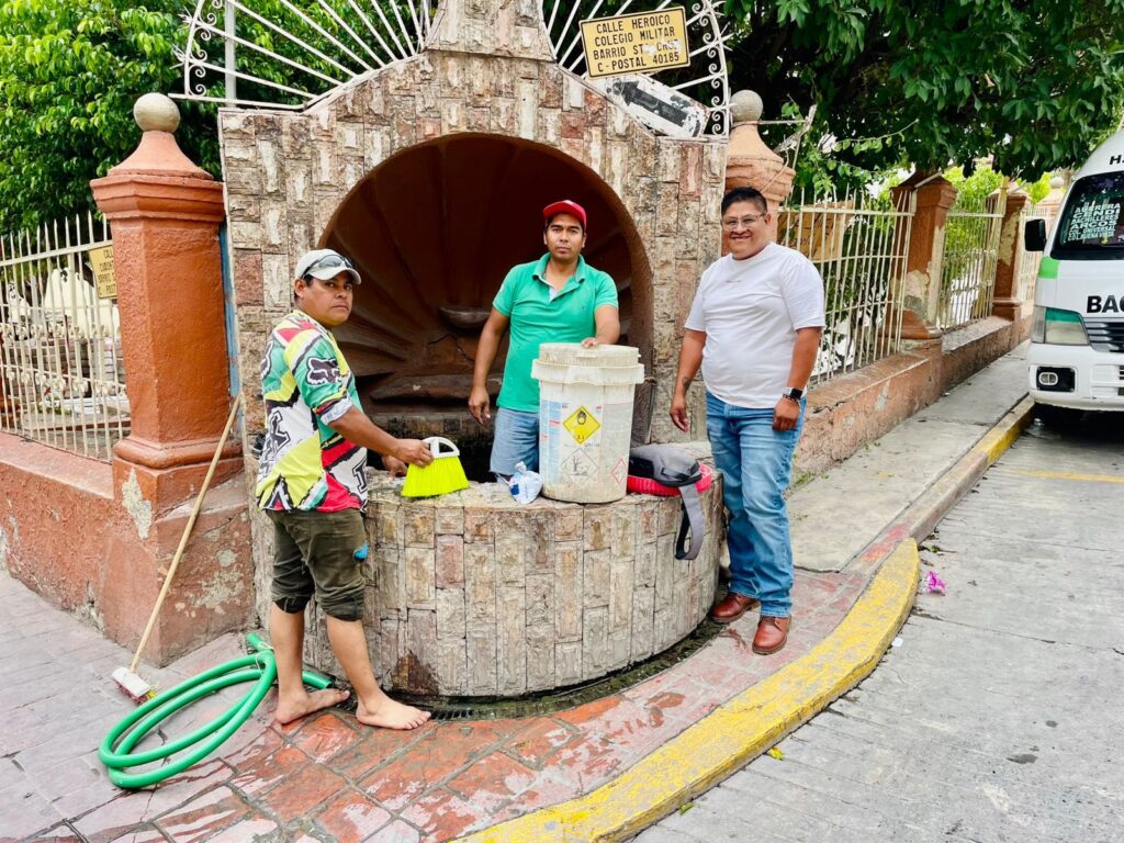 Con el objetivo de abonar a la mejora de los espacios públicos, el Gobierno que preside la Q.B.P. Sara Salinas Bravo, a través de la Dirección de Agua Potable y Alcantarillado, realizó labores de limpieza y mantenimiento a la pila de agua conocida como «La Conchita», ubicada en la cabecera municipal.