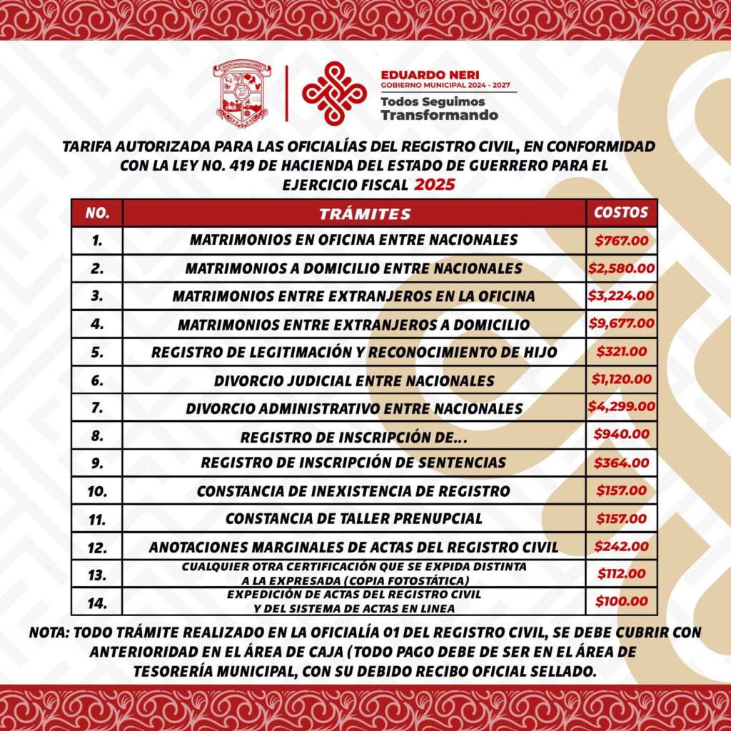 Tarifa Autorizada para las Oficialías del Registro Civil, en Conformidad con la ley 419 de Hacienda del Estado de Guerrero, para el ejercicio fiscal 2025