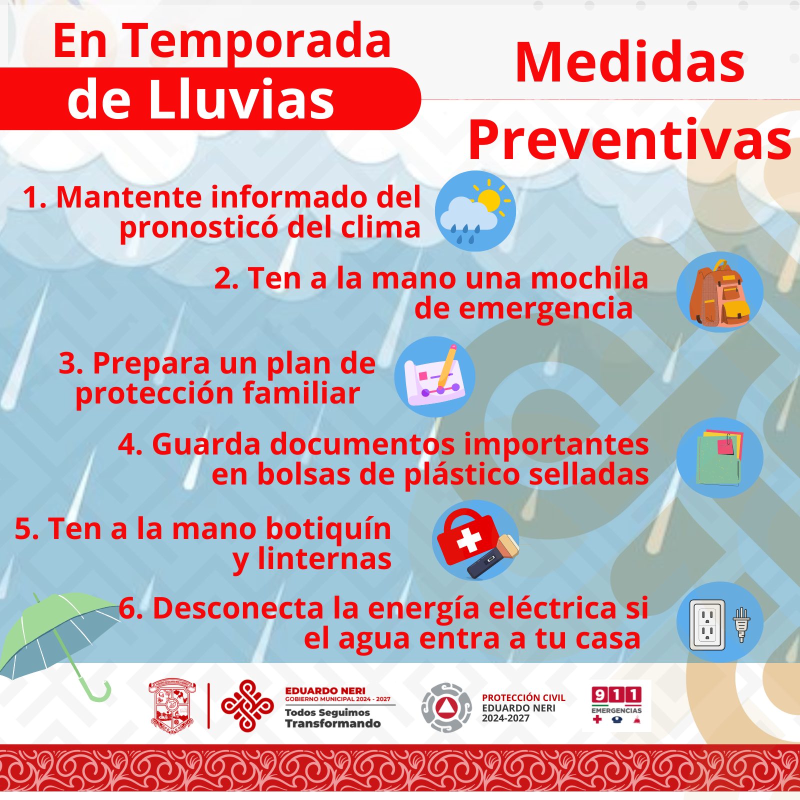 Ante el pronóstico de lluvias que se mantiene en nuestro estado por el paso de la Tormenta Tropical «Erick», y que en las próximas horas hay probabilidad que evolucione a huracán, los invito a permanecer informados en las páginas oficiales y a seguir puntualmente las recomendaciones de Protección Civil Municipal así como las emitidas por nuestras autoridades estatales.